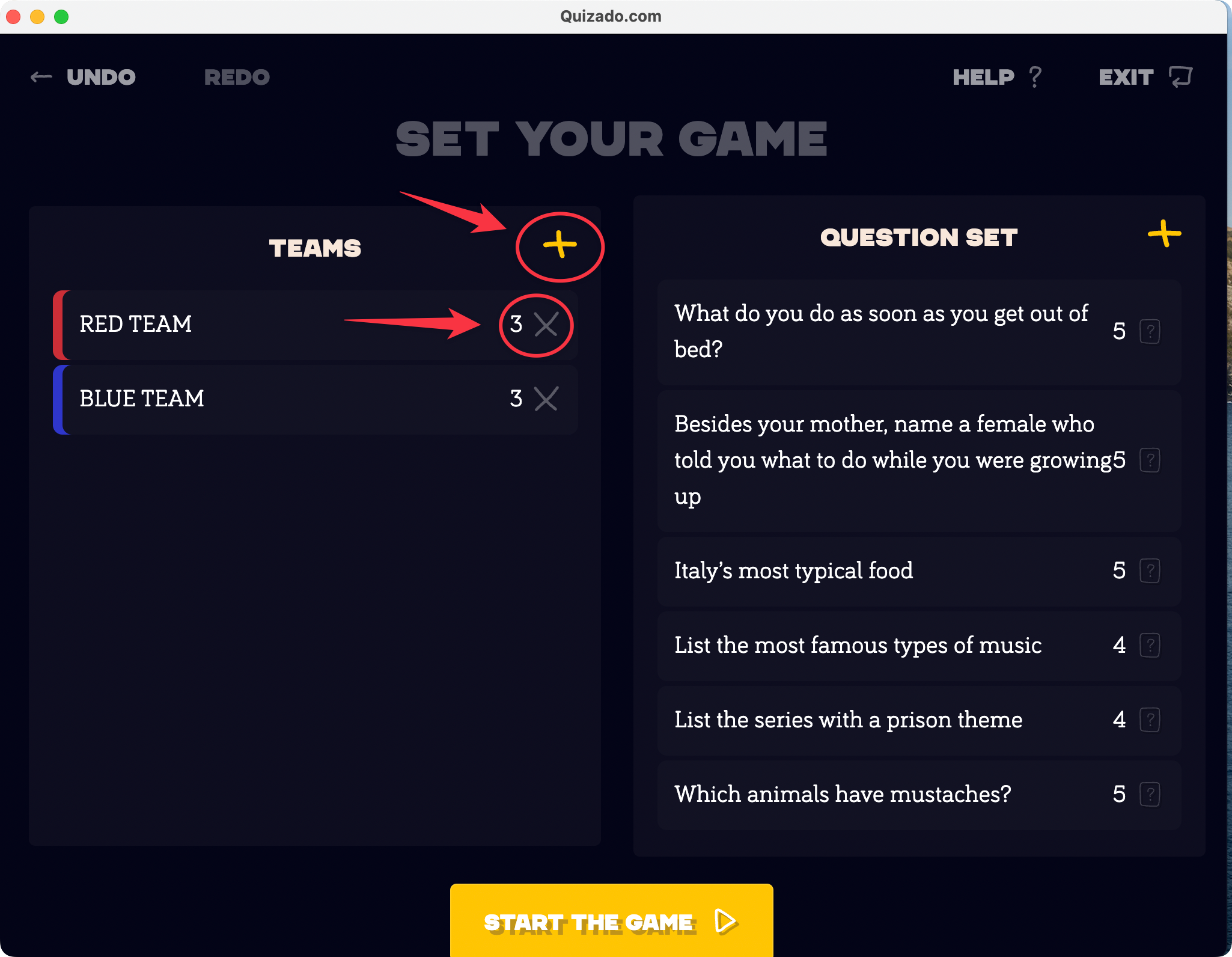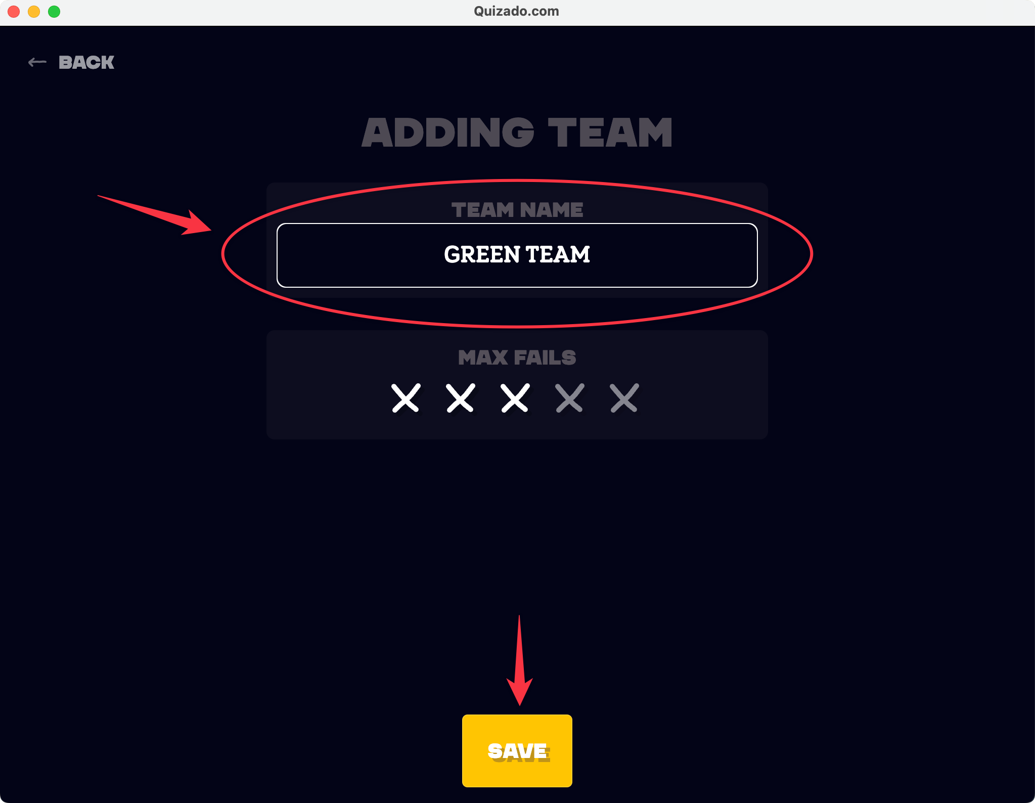 Next, you can modify the number of teams on the start screen by using the "Add another team" button or you can easily edit the already existing team by hovering the pointer on the number of fails possible in each team.