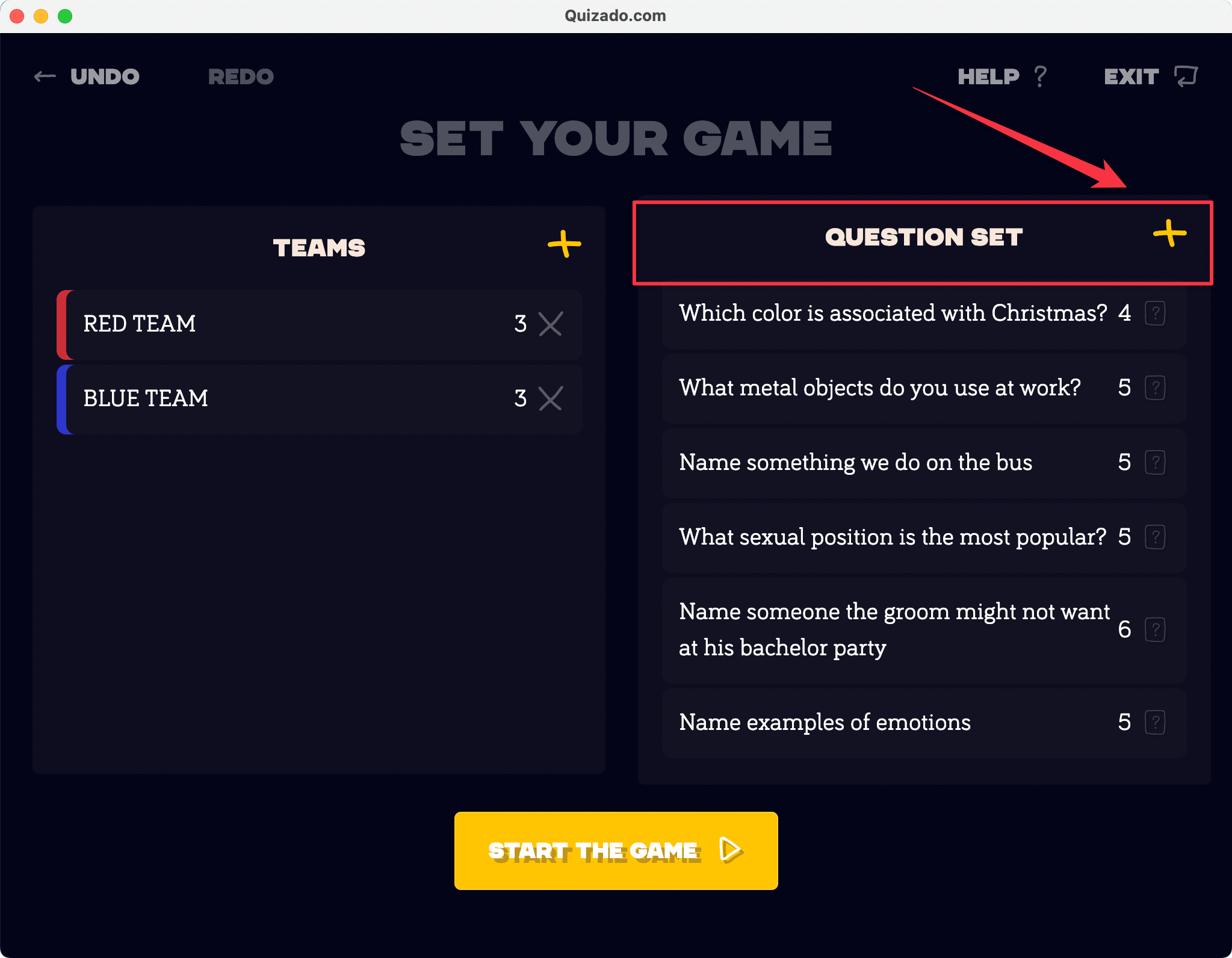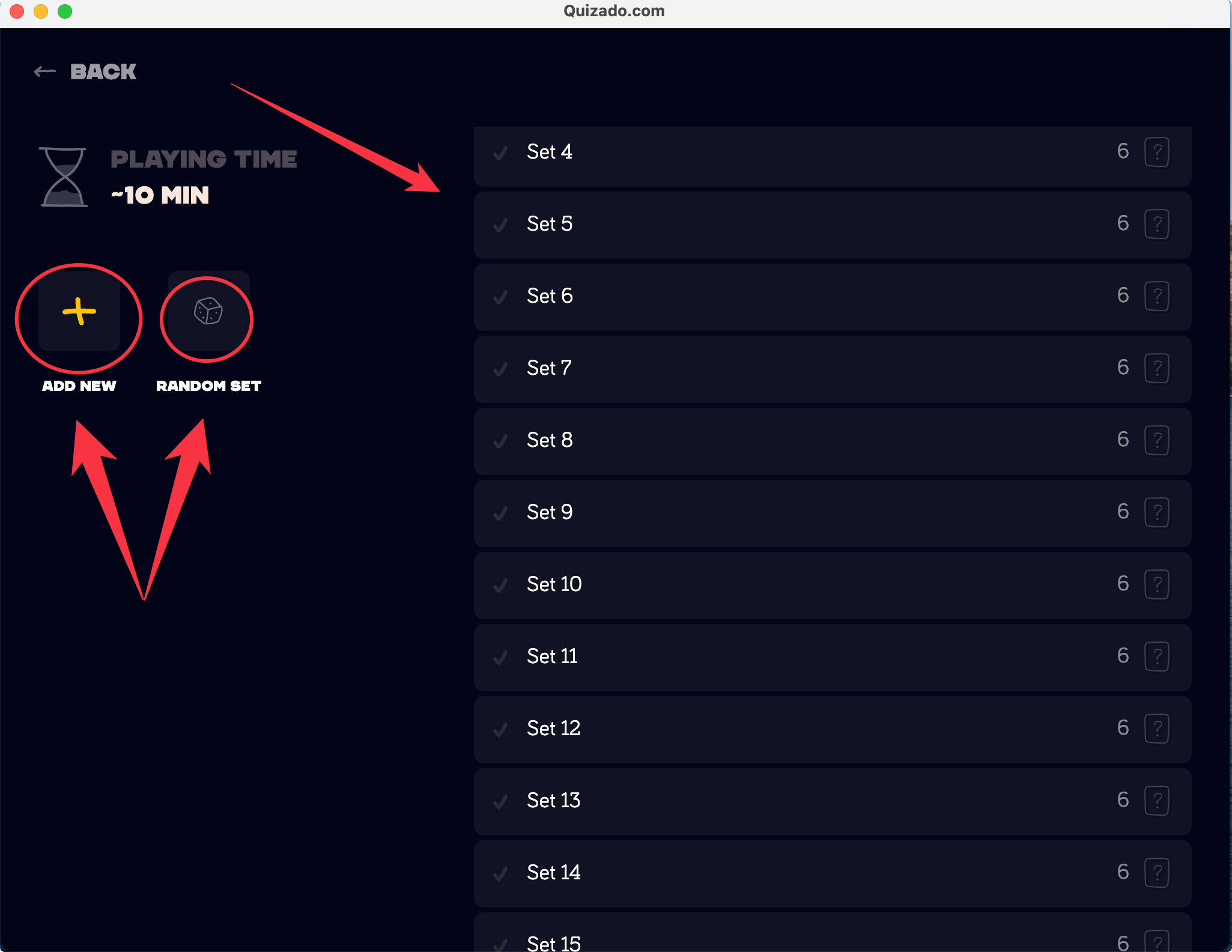 Here you can choose a specific question set created by us, add your own, or draw a random one. On the left side, there are two buttons: "Add new" and "Random Set", but on the right side of the interface, you can find sets created by us.