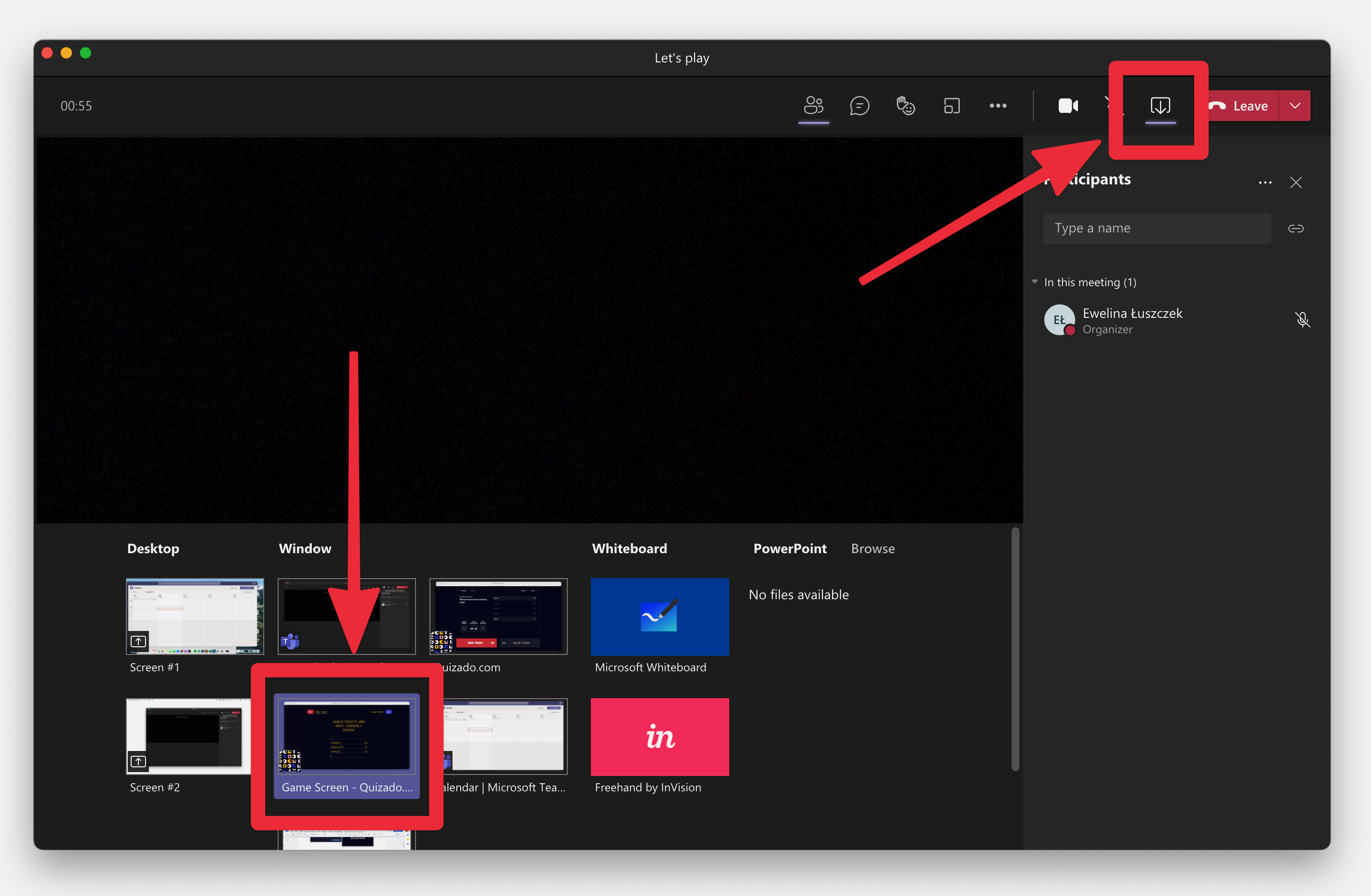 2. Activate the sharing option in the video conference program. Select the option WINDOW and choose “Game Screen - Quizado.com” window to share with the participants.